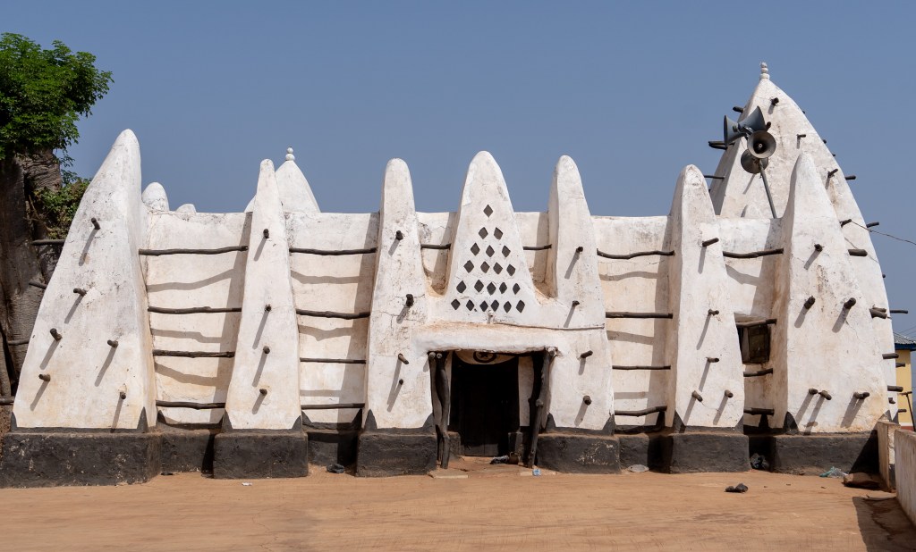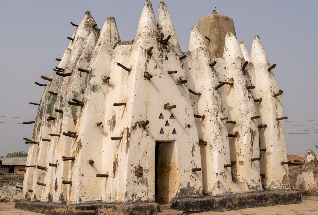 I’d love to visit all the ancient mosques, and was about to head to Bole Mosque recently when, in checking directions, I saw a news article about its collapse in September 2023. As you might expect from very old (Larabanga is estimated to have been built in the early 17th Century) earthen buildings, the mosques’ upkeep and preservation are contested issues. Apostos describes how, following the partial collapse of Larabanga Mosque in 2002, the Larabanga community had different priorities from the international funders supporting its restoration. While the funders wanted the outside to remain an unpainted ‘earthy’ hue, locals wanted to paint it white, a colour more in keeping with its spiritual significance. Following its restoration, and finding the resulting mosque too difficult to maintain, the exterior was soon cemented and painted white. Ironically, it was the cementing – done in the 1970s by the public works department – which had led to the mosque’s collapse, as the moisture trapped inside the earth by the cement caused the material to rot. Architecture responds to the systems (environmental, social, cultural) it fits within – but what happens when those systems change? And who gets to say what ‘preservation’ should be?