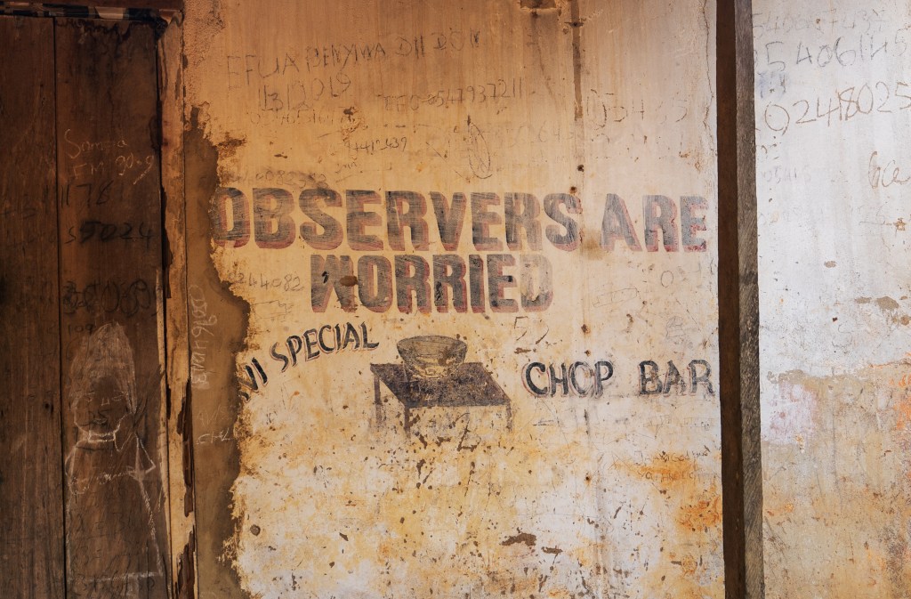 If you had to choose two words to describe Ghana, ‘semiotically rich’ might just cover it. Signs, slogans and symbols cover every available surface and space: taxis bearing mottos like Be Wise and Travel And See pass shops and restaurants like Lack Of Knowledge Suiting Materials And Boutique, Faithful Jesus Carpentry Shop, Do The Right Thing Cold Store, Amazing Power Hydraulic Ventures and Observers Are Worried Chop Bar.1 Sayings, proverbs, religious messages and advertisements are continually being remixed and improvised on producing, in the words of Ato Quayson, a “scintillating zodiac of inscriptions.”