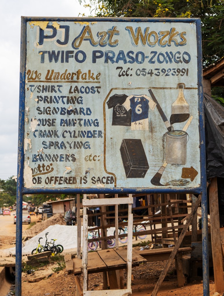 It’s not just about interesting wordplay, however – Ghana (like other sub-Saharan African countries) has a rich tradition of hand-painted signs advertising local barber shops, beauty salons (or, as they’re more often written, beauty saloons. It’s better, no?), shops and restaurants. Even typically homogenised signs, like the corporate logos of telecom companies, are often hand-painted. However, as digital sign printing takes over, hand-painted signs are becoming less prevalent – while at the same time also cropping up in galleries in the West. Some have speculated that when the transition from paint to print is complete, and enough separation makes traditional sign-painting ‘heritage,’ there might be a resurgence of appreciation for the ‘old’ methods of sign-making.
